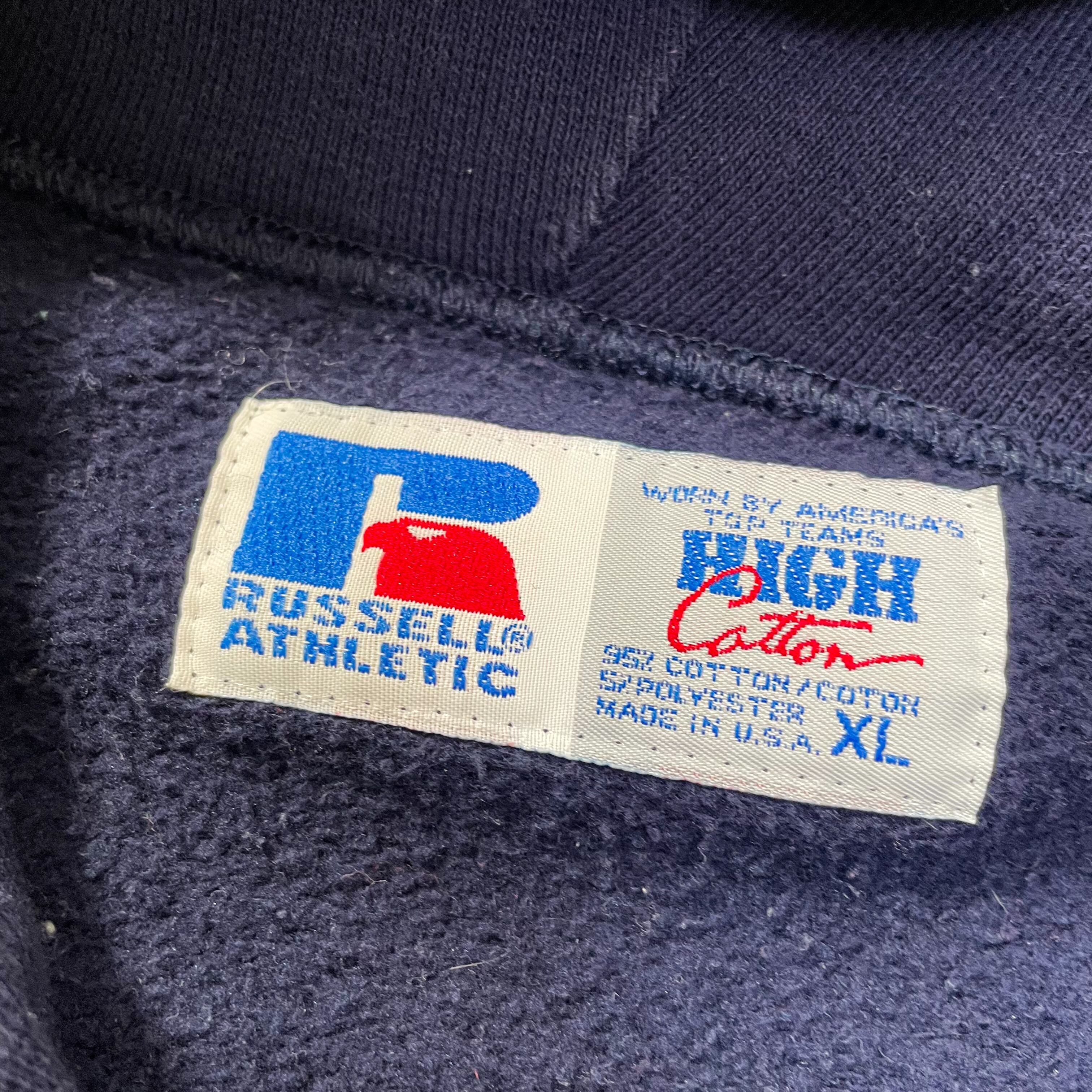 1990s " Russell / Highcotton " navy cotton sweat parka . made in usa . size xlarge.