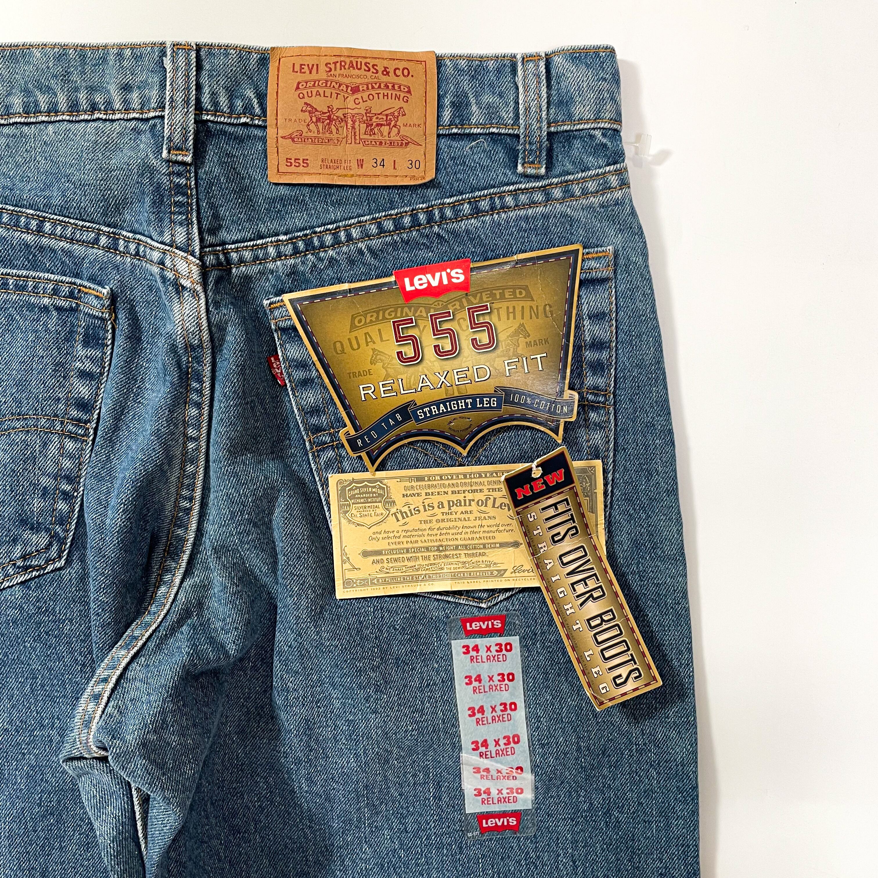 dead stock 1990s " Levi's 555 " relaxed straight denim pants . made in usa . size 34×30.