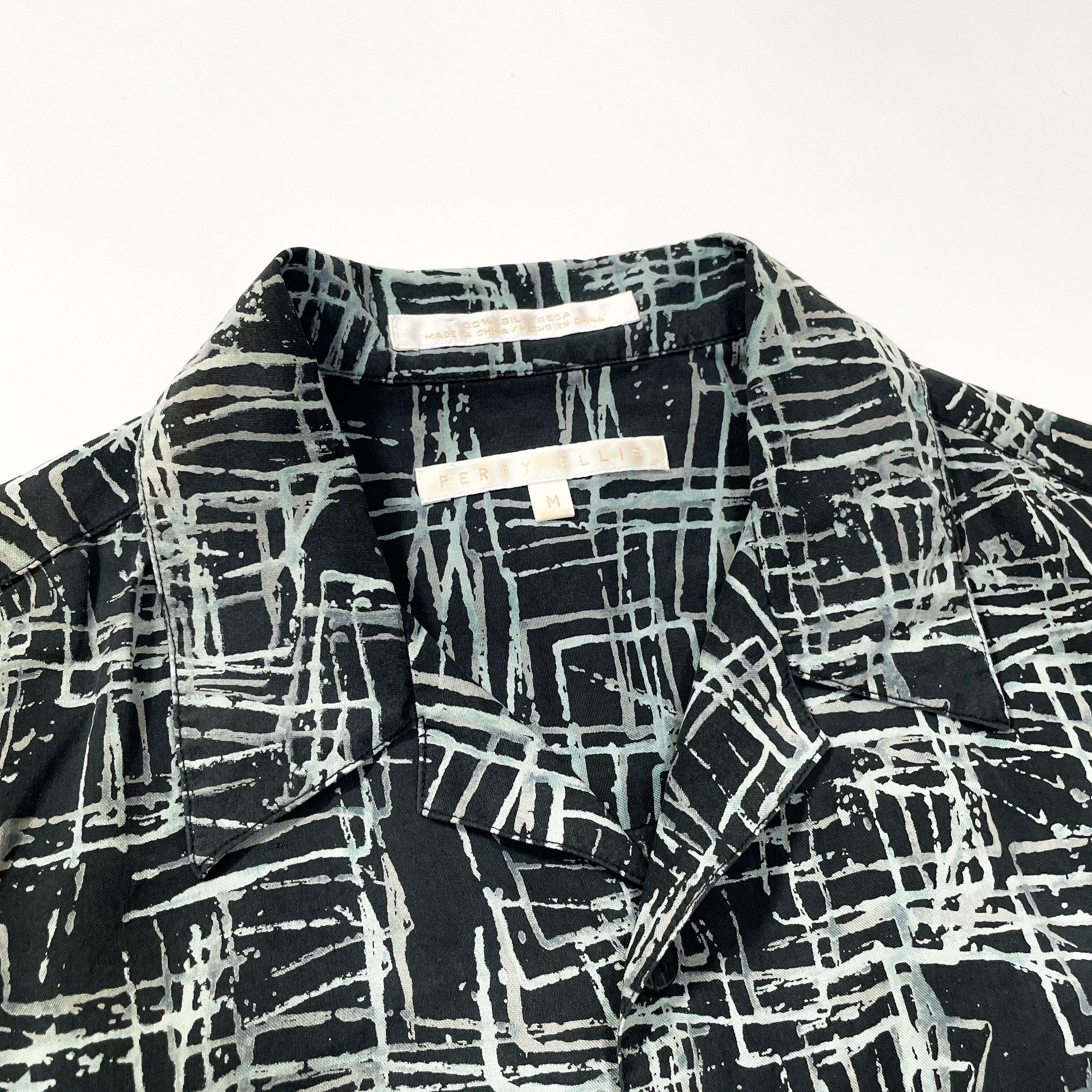 1980s " Perry ellis " black silk open collar shirts. size medium .