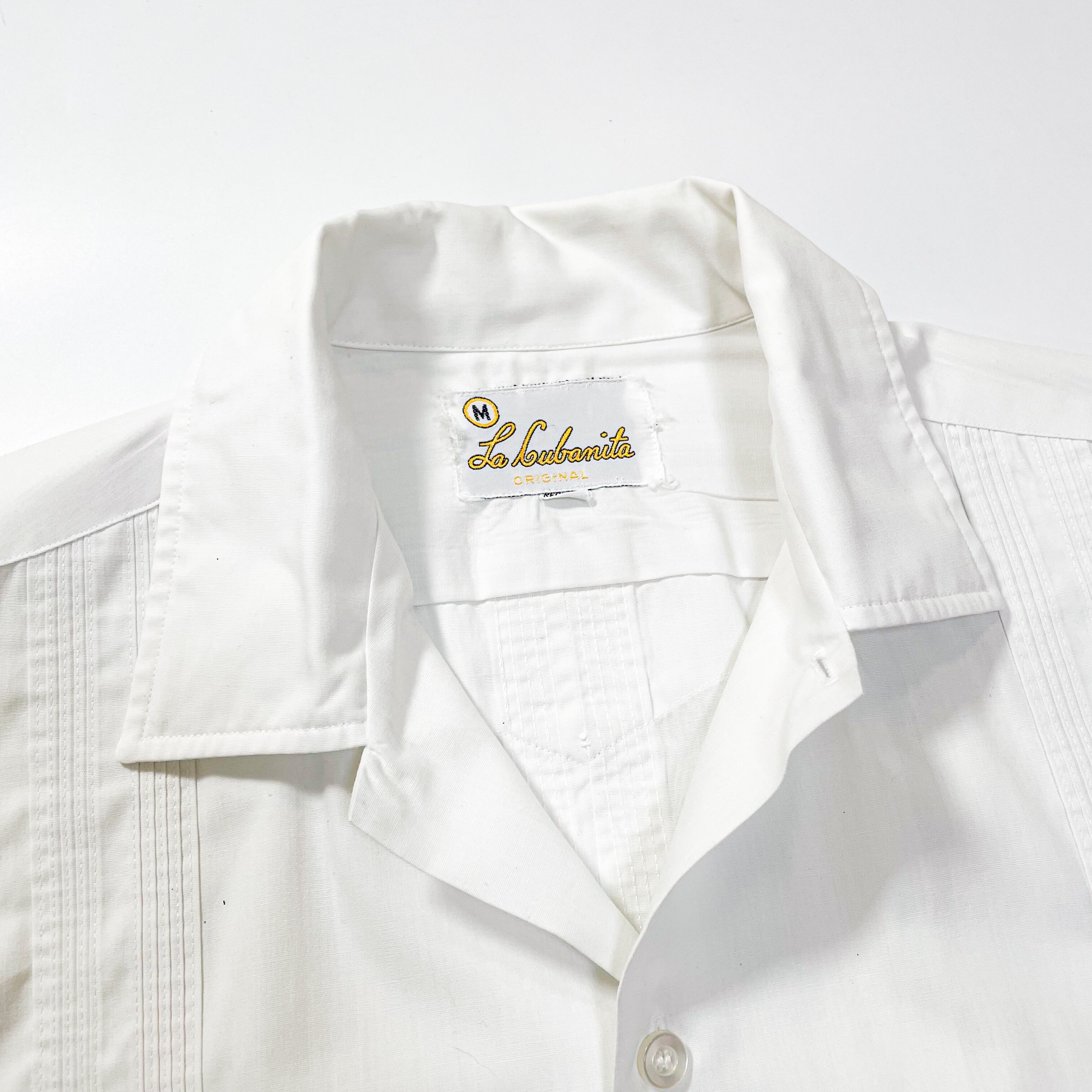 1970s " Le Cubanita " white cotton poly open collar cuba shirts . size medium .