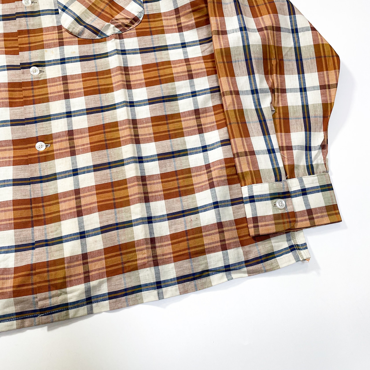 通年着れるコットン生地で台襟無しオープンカラー。