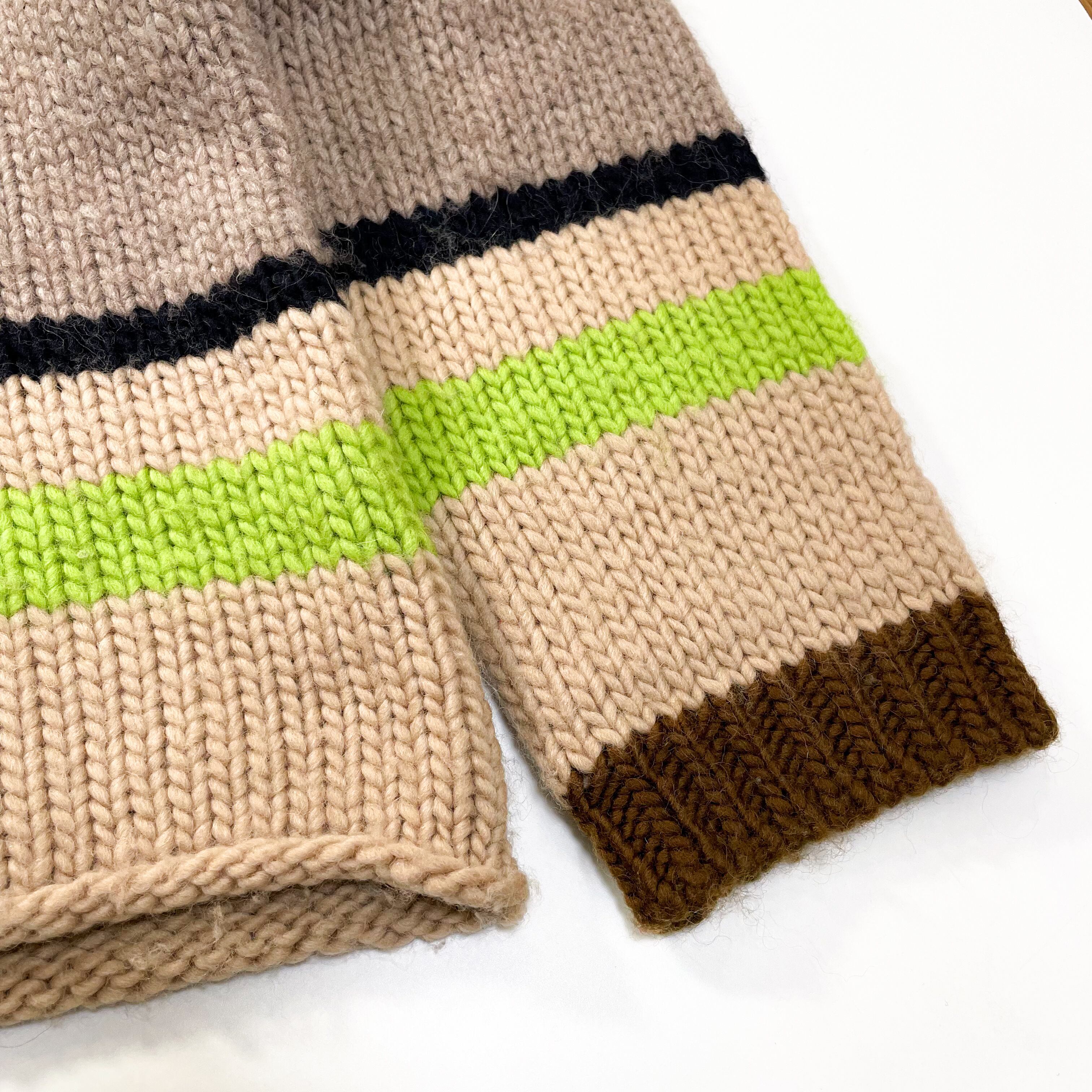 ローゲージ寄りな編み目でふんわり柔らかいウール生地でモカブラウンベースに多色使いのマルチボーダー。