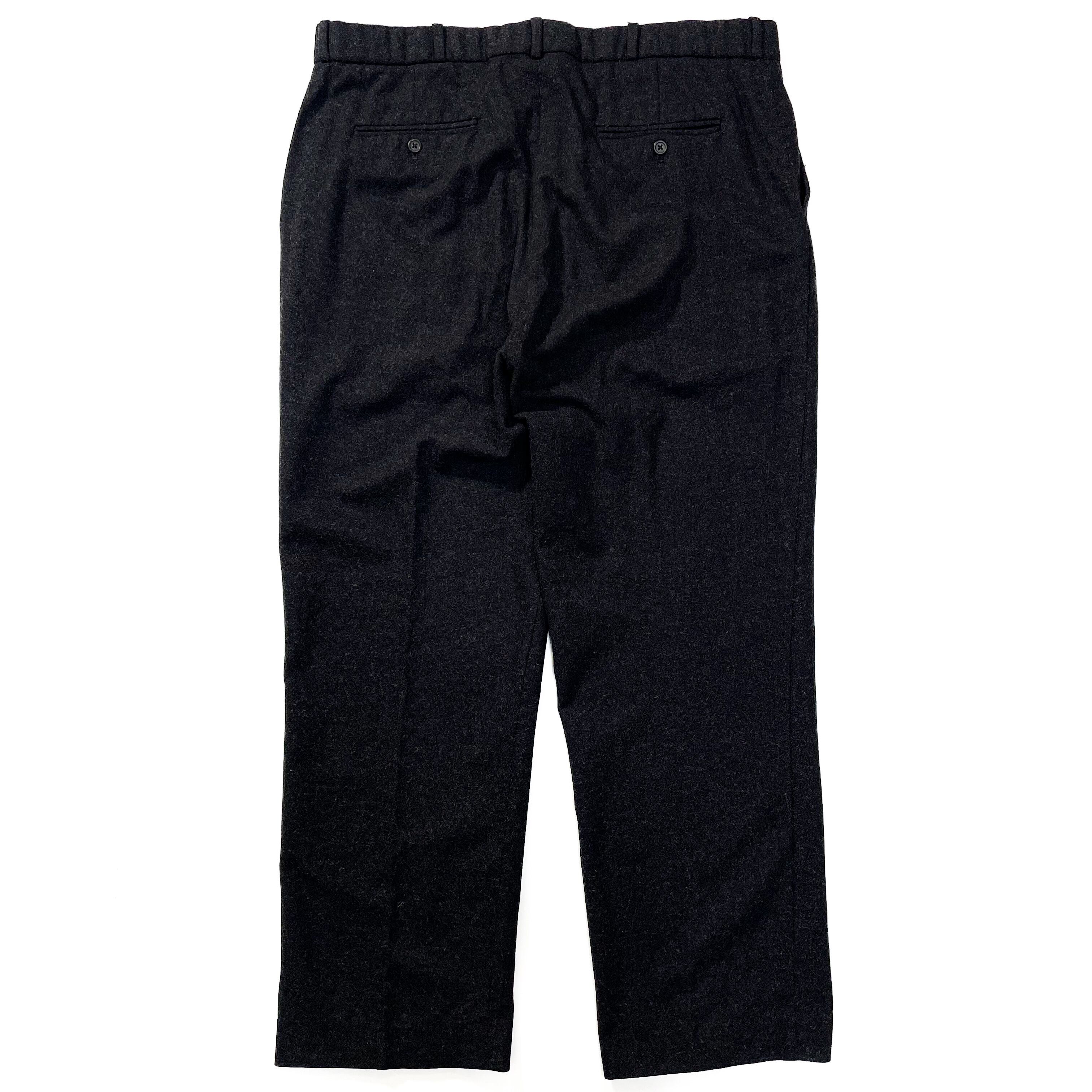 秋冬に穿けるスラックスでワイドシルエット、暗い色味と重宝するパンツ。