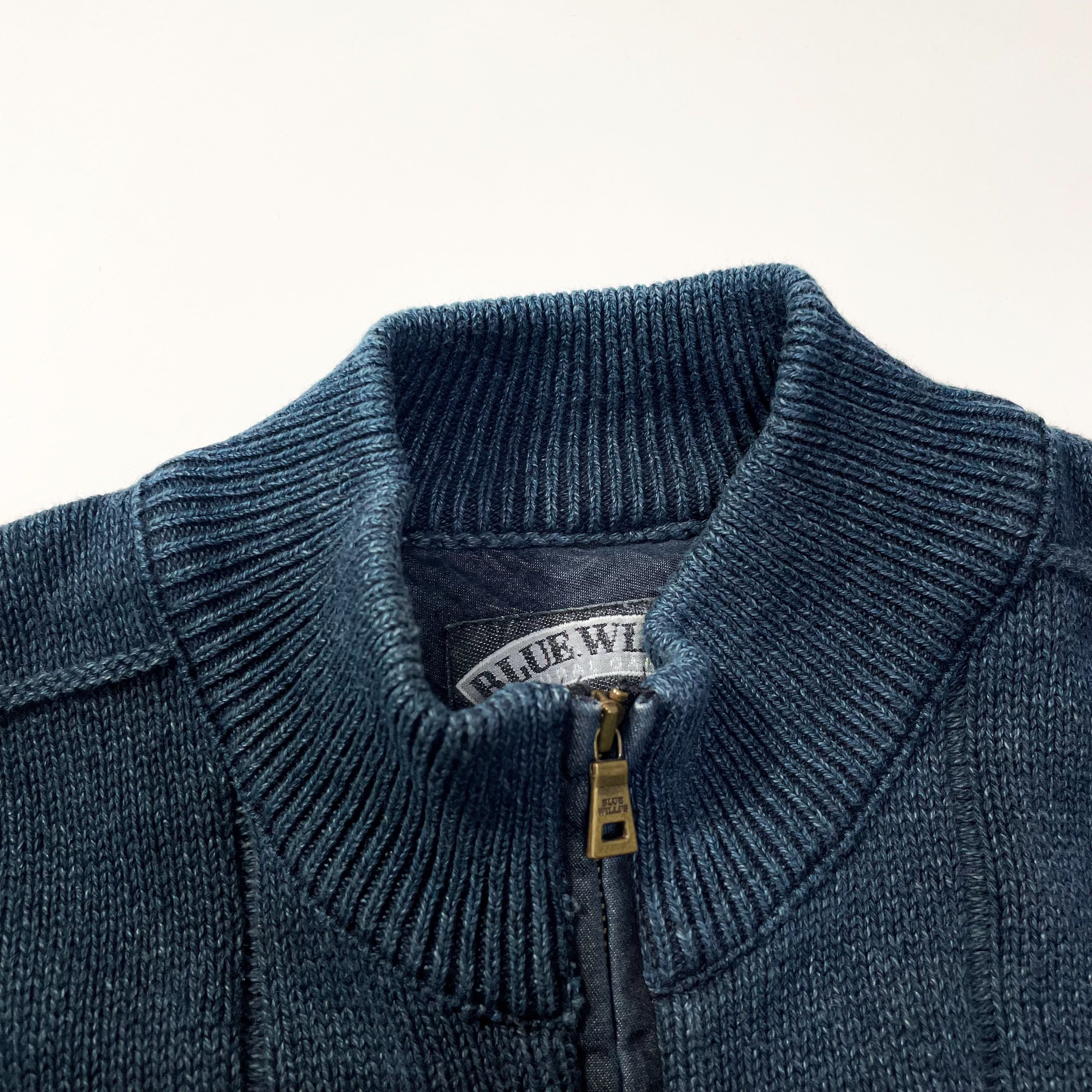 1990s " Blue Willi's " indigo cotton drivers knit jacket . made in Denmark . size large.