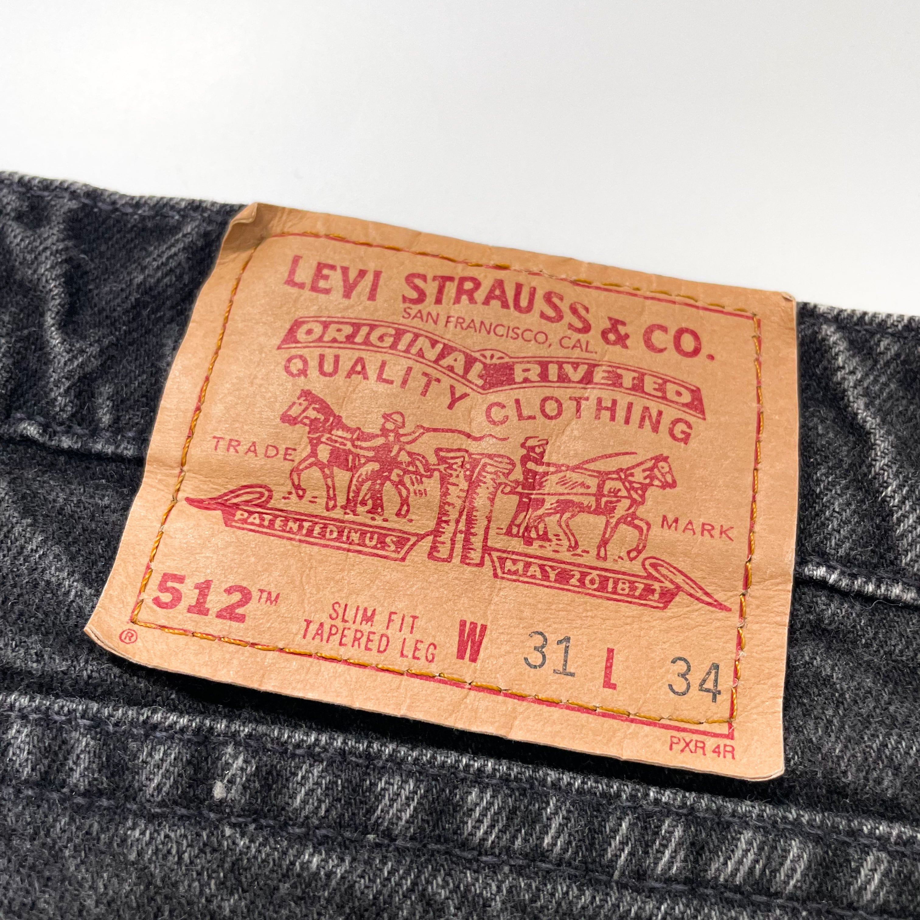 1990s " Levi's 512 " slim tapered black denim pants . made in usa . size 31×30.