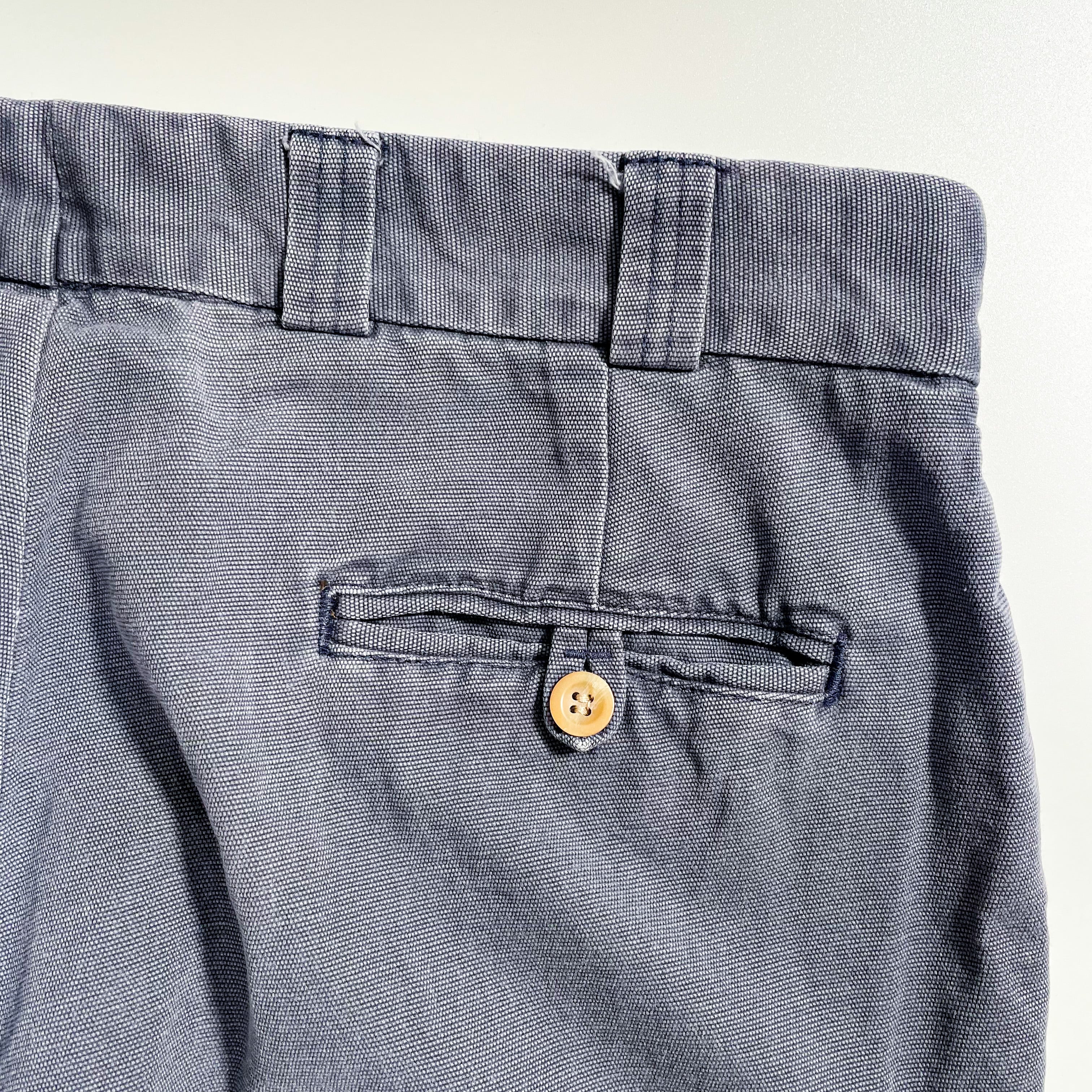" bills khakis / M2P " faded navy duck two tuck trousers . made in usa . size 33×29 .