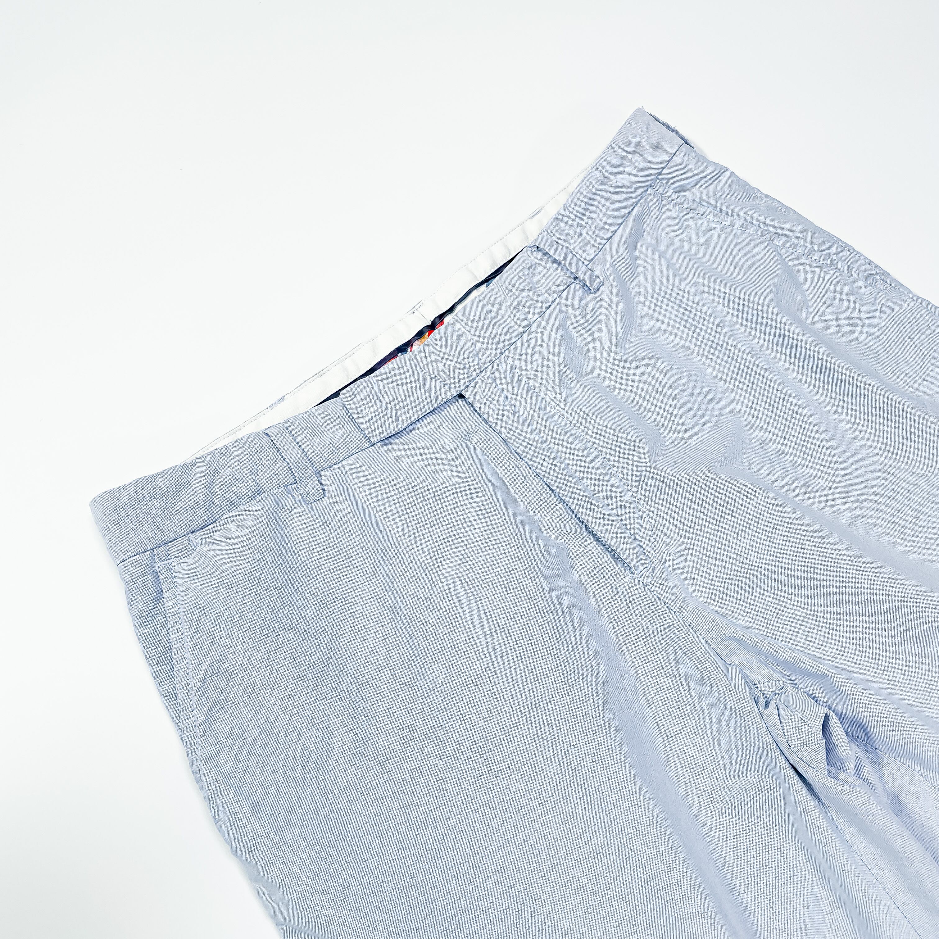 サックスブルーのオックスフォードシャツ生地のパンツ。