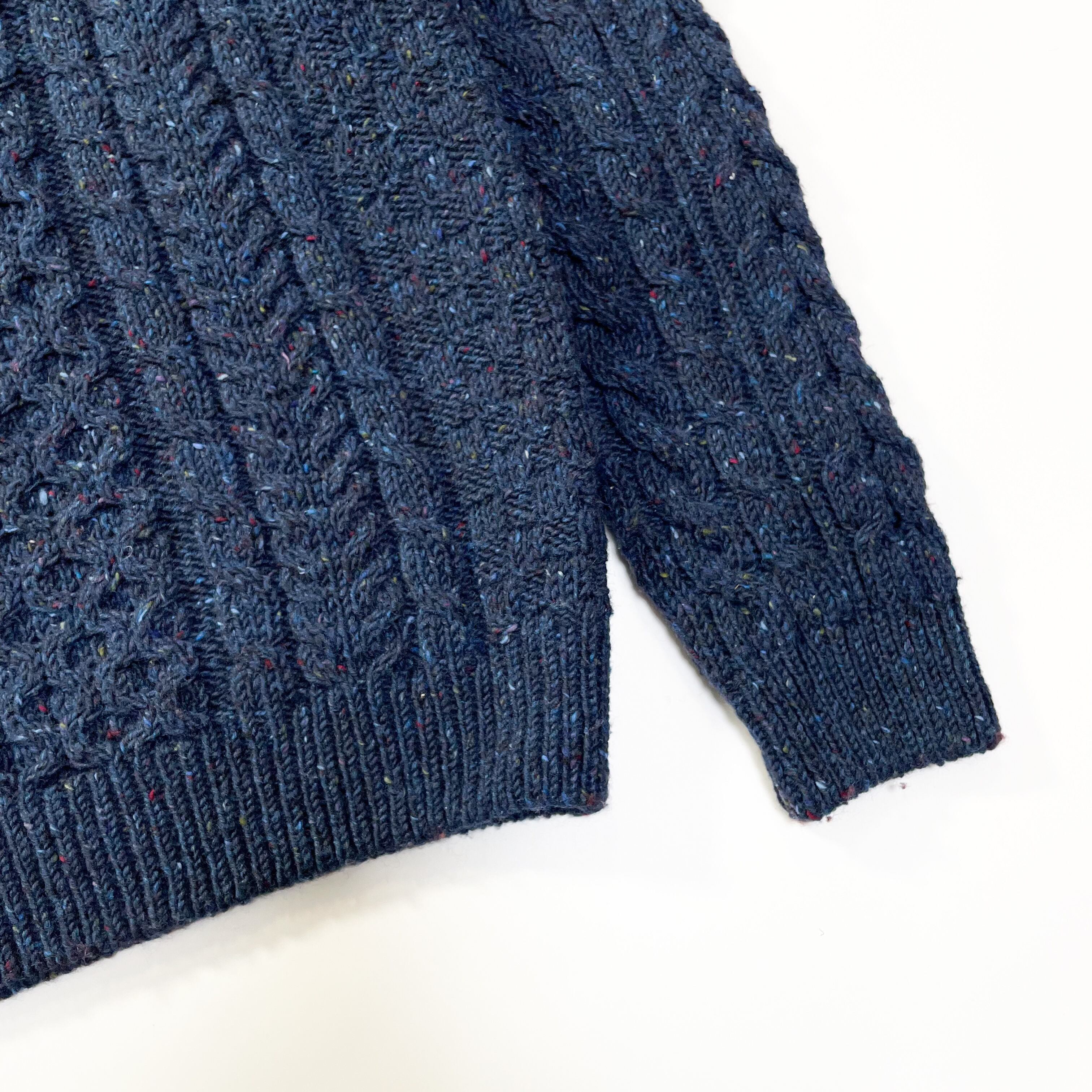 フィッシャーマンセーターでも珍しいブルーベースにカラフルなネップの散りばめられた1着。