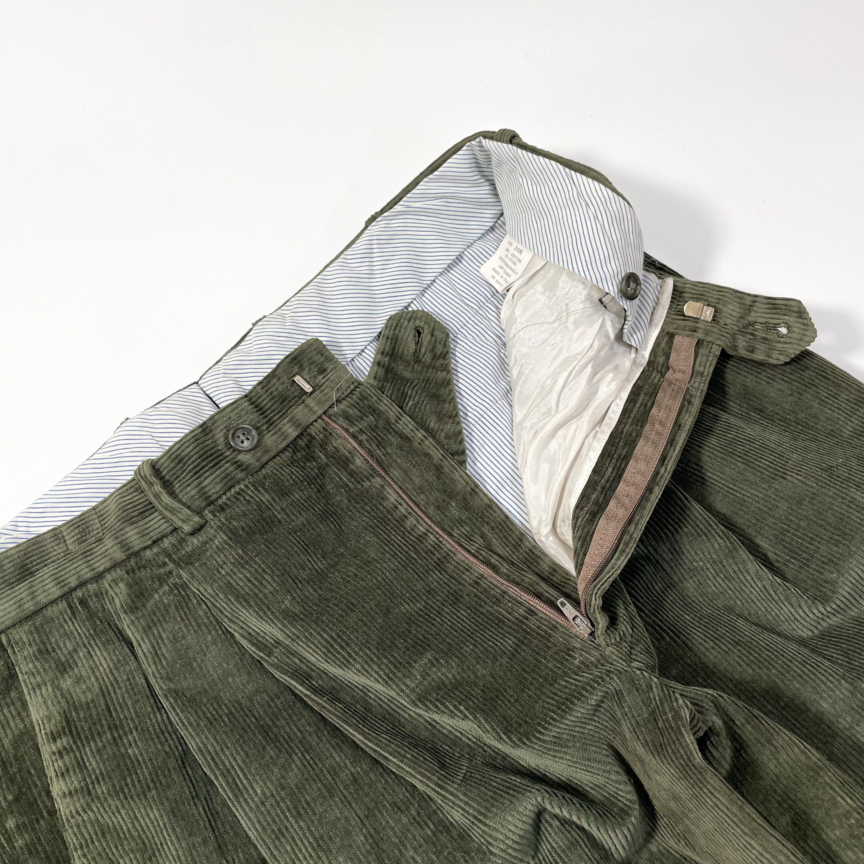 1980s " Nordstrom / JB britches " olive corduroy two tuck slacks . made in Italy . size 34×29 .