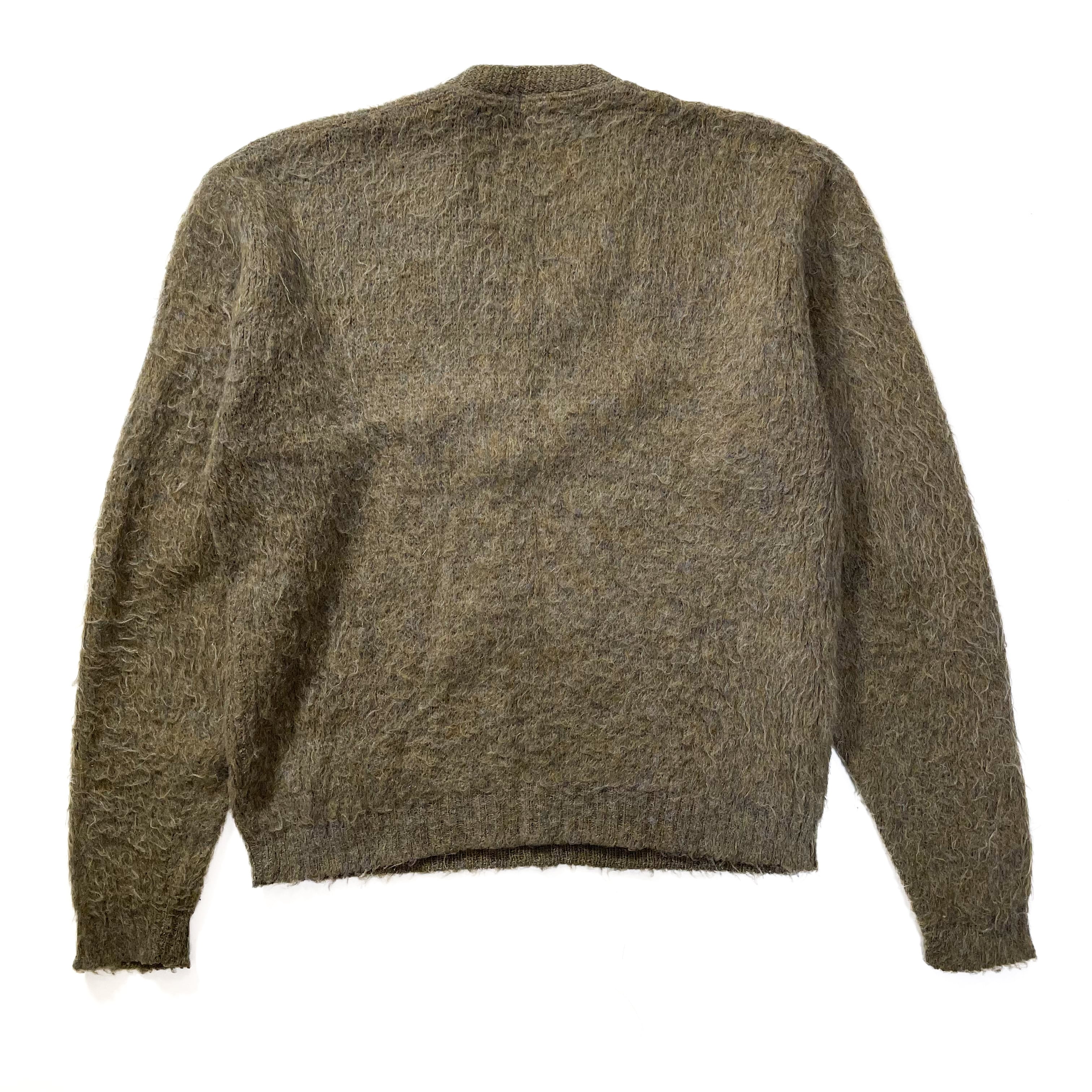 オリーブ、カーキ系の色味でミックスカラー、毛足の長いシャギーモヘア。