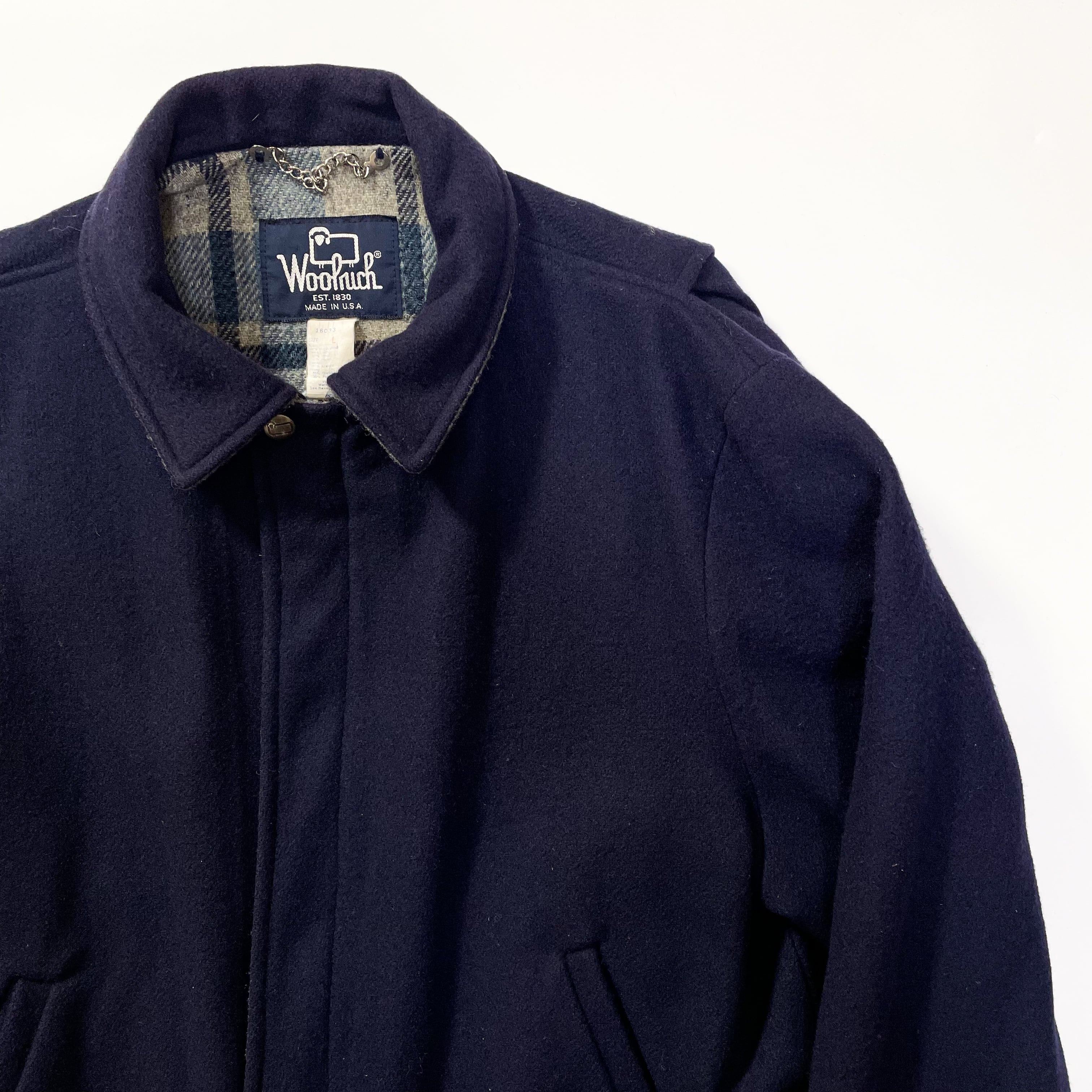 1980s " Woolrich " navy wool zipup jacket . made in usa . size large