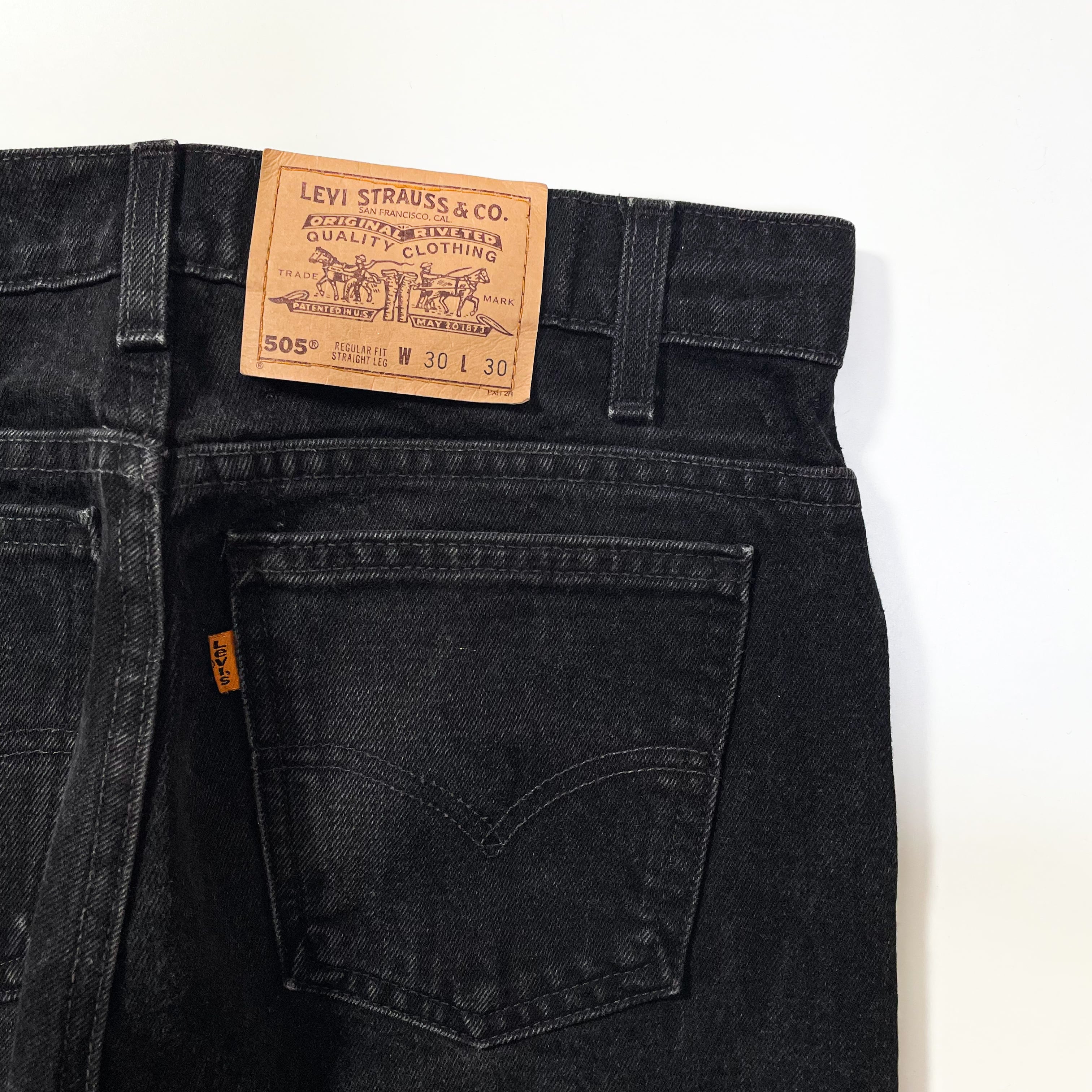 1990s " Levi's 505 " black denim straight pants . made in usa . size 30×30.