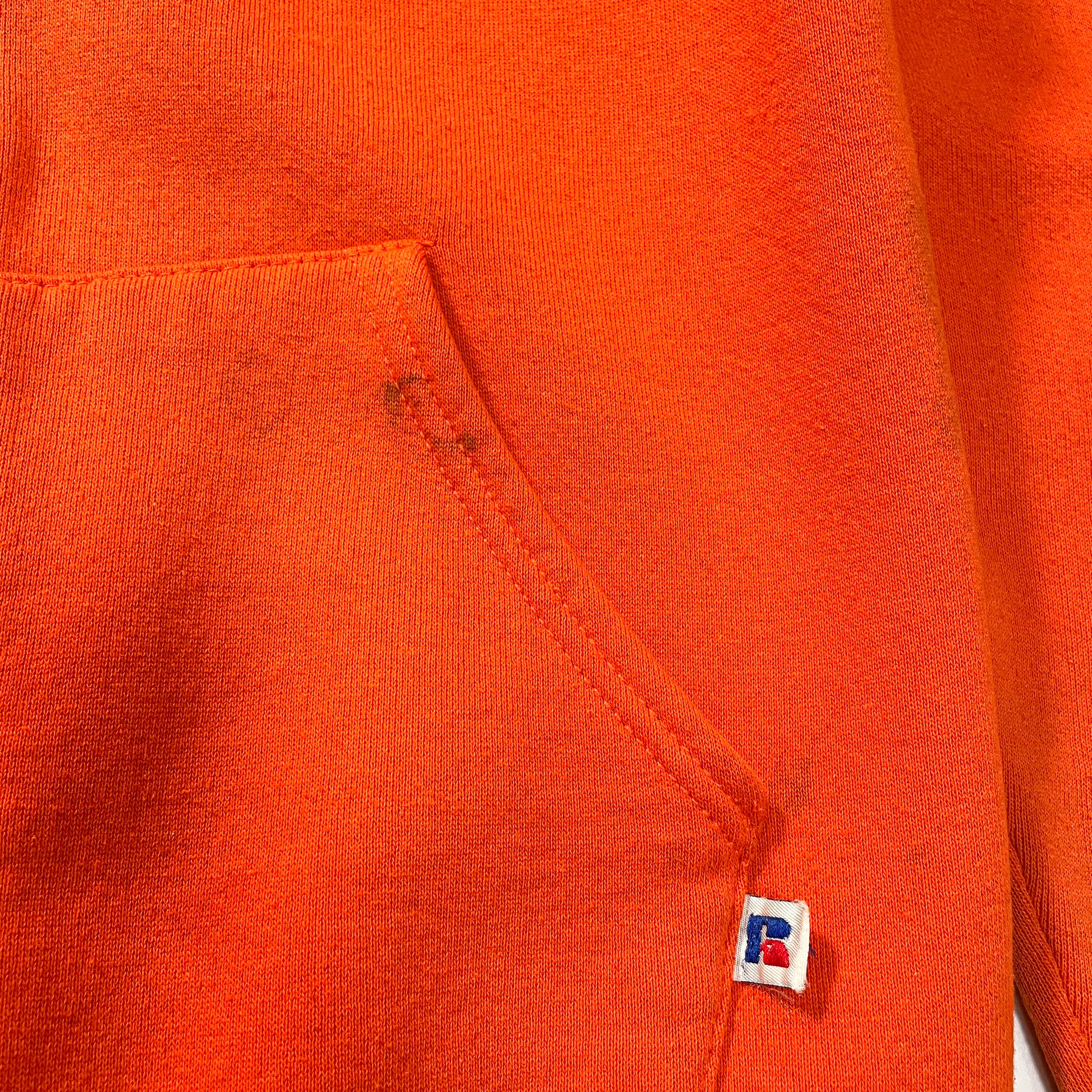 1980s " Russell " faded orange zip up sweat parka . made in usa . size small .